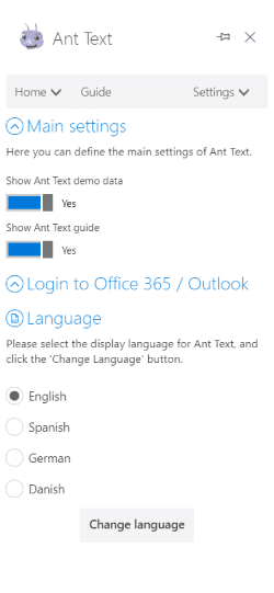 In the main settings you can toggle whether to show or hide “Ant Text demo data” and the “Ant Text Guide”.