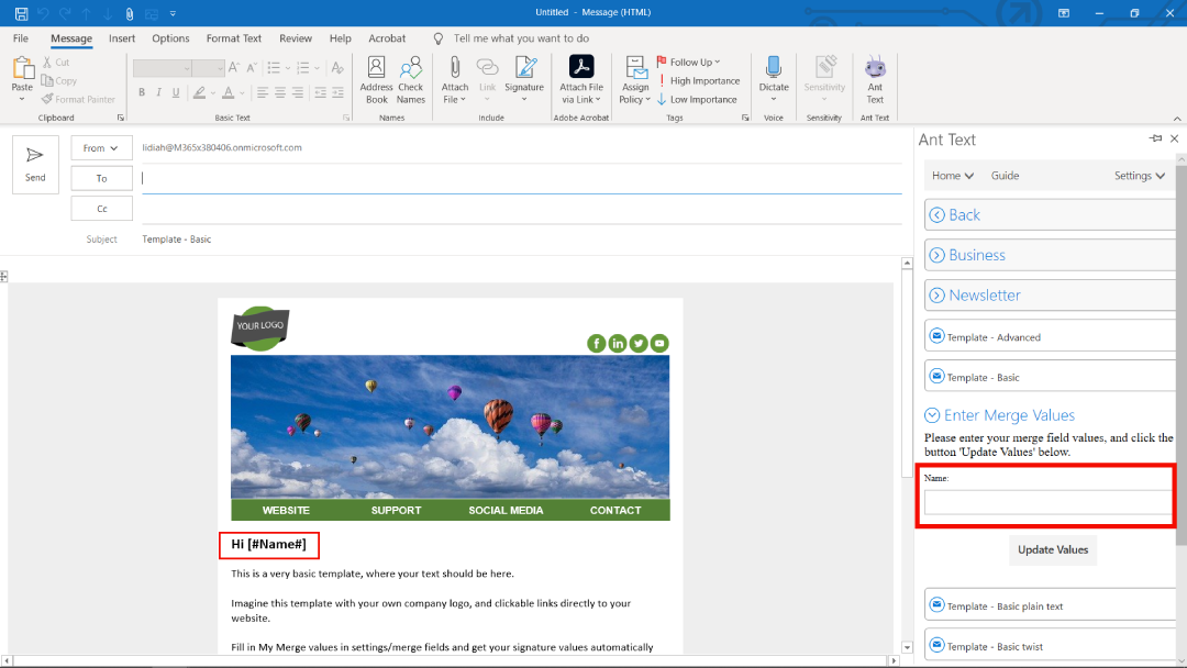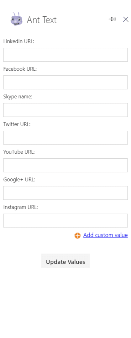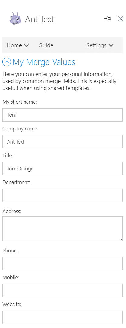 Insert any single line or multi line with your own customized names into your templates and save them. Next time you open the template from the Ant Text panel, there will be an option to fill out the customized merge fields under the template you just opened.