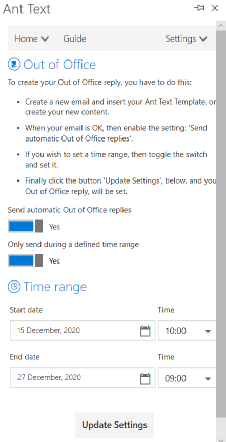 In case you know when your time off will start and end, you can check the second toggle, “Only send during a defined time range“. Afterwards, add your time range (remember to add the start date, time, end date and time) and then click on the “Update Settings” button.